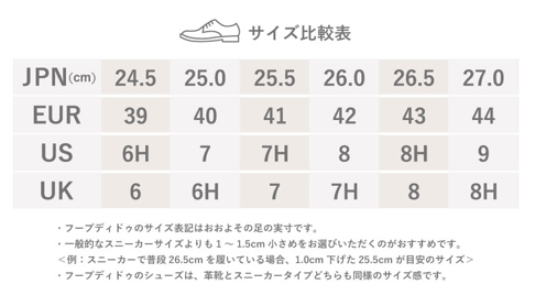 【サイズ】 普段革靴で25.5cm、ライニングやインソールにクッションが入っているスポーツ系スニーカーで26.5cm~27.0cmを使用するスタッフで<25.5cm/41商品サイズ>がちょうどよかったです。 ※サイズ感は、個人差がございますので参考程度にお考え下さい。